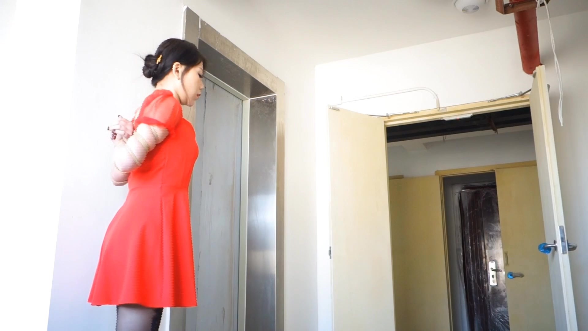 嫣儿户外系列,身着低胸红色连衣裙黑丝袜高跟鞋,在楼道内偷偷被捆,超紧的五花缚后再用绳子收紧两臂,最后固定住两手拇指,紧的嫣儿呲牙咧嘴,啊的叫出了声,绳子深深陷入肉中,不一会两臂就成了紫色,然后在跪在电梯前拍摄,随时可能被人撞见