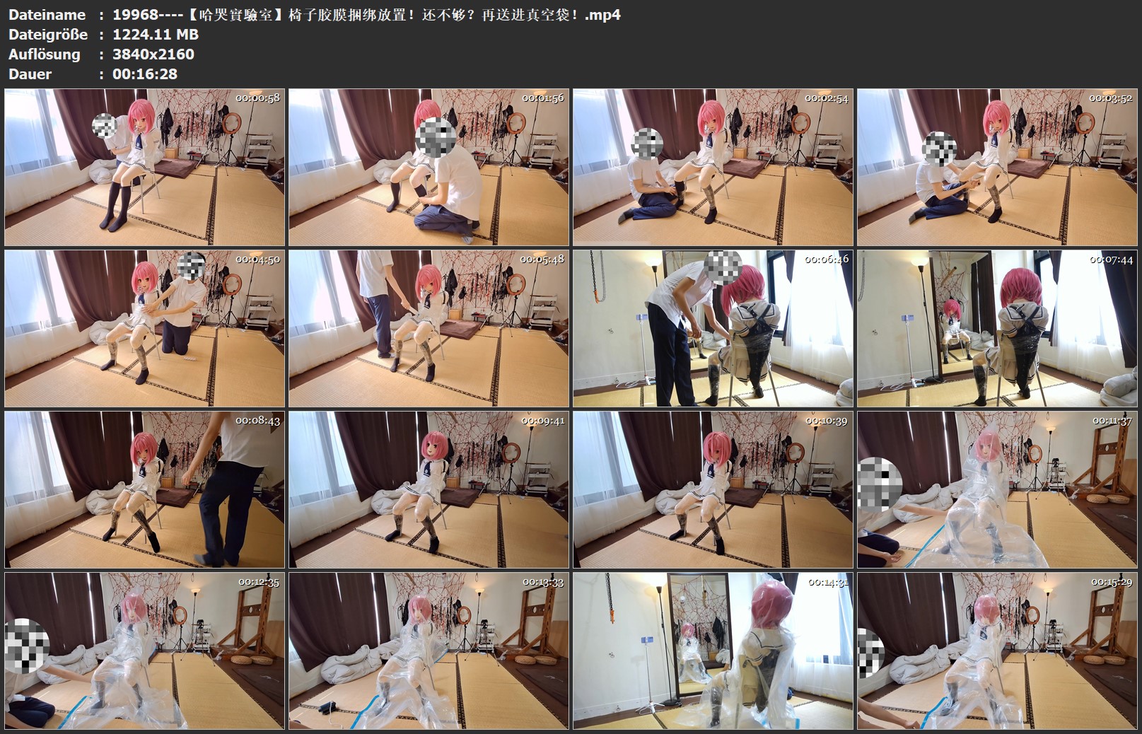 双手在背后被单手套拘束,身体被胶膜捆绑在椅子上,已经完全无法动弹,只能被[X_X]玩弄,结果还被连同椅子丢进了真空袋里,被狠狠的压缩啦~~