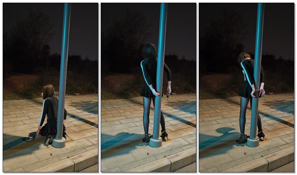 这次不仅双手背铐在红绿灯柱子上 还把脚铐也从后边穿了过去 整个身体都被限制住只能原地转圈做不出任何多余的动作