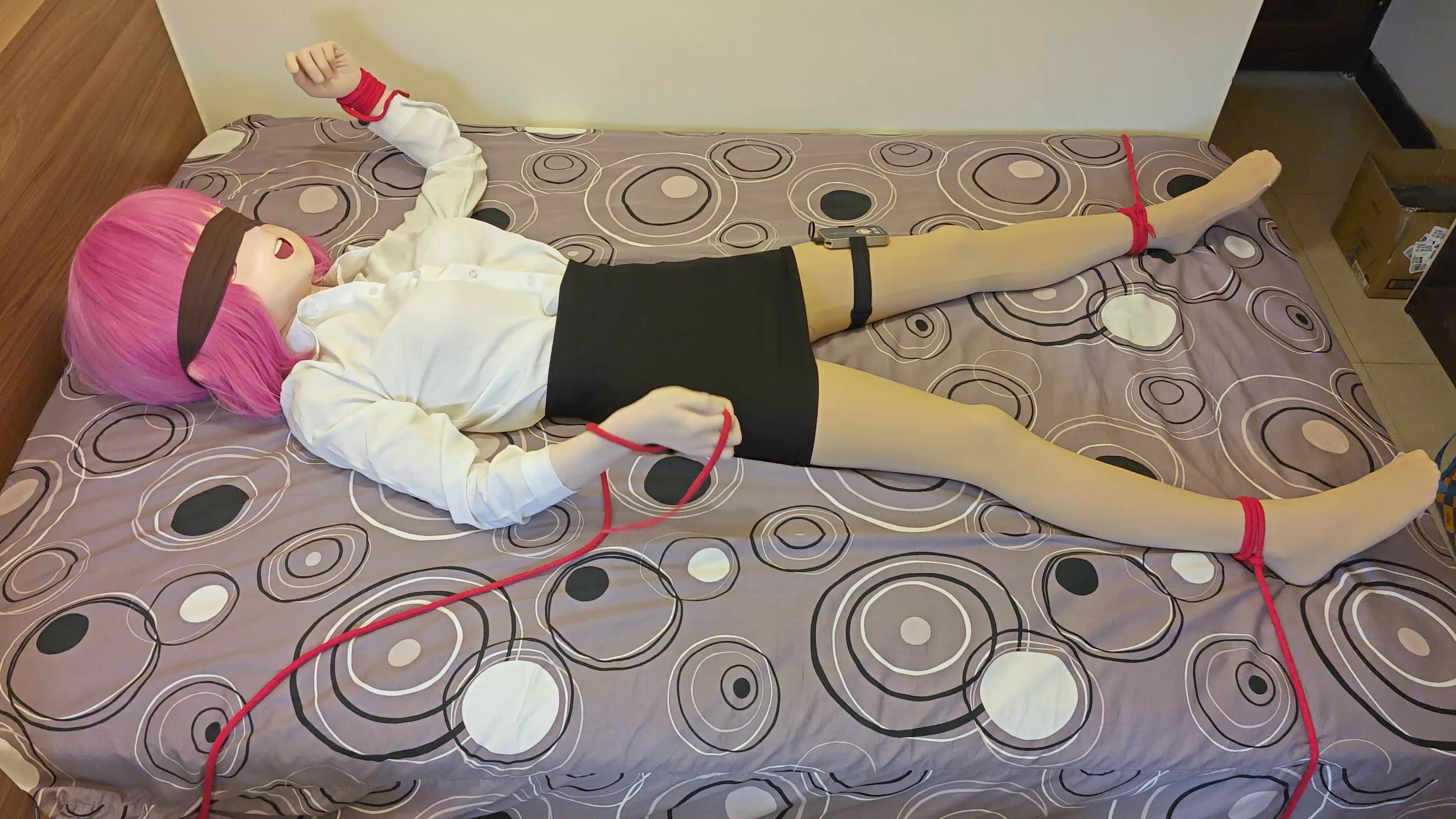 OL套装配上肉丝,自己乖乖蒙上眼,绑在了床上,在郊狼和震动下,再套上了袋子~