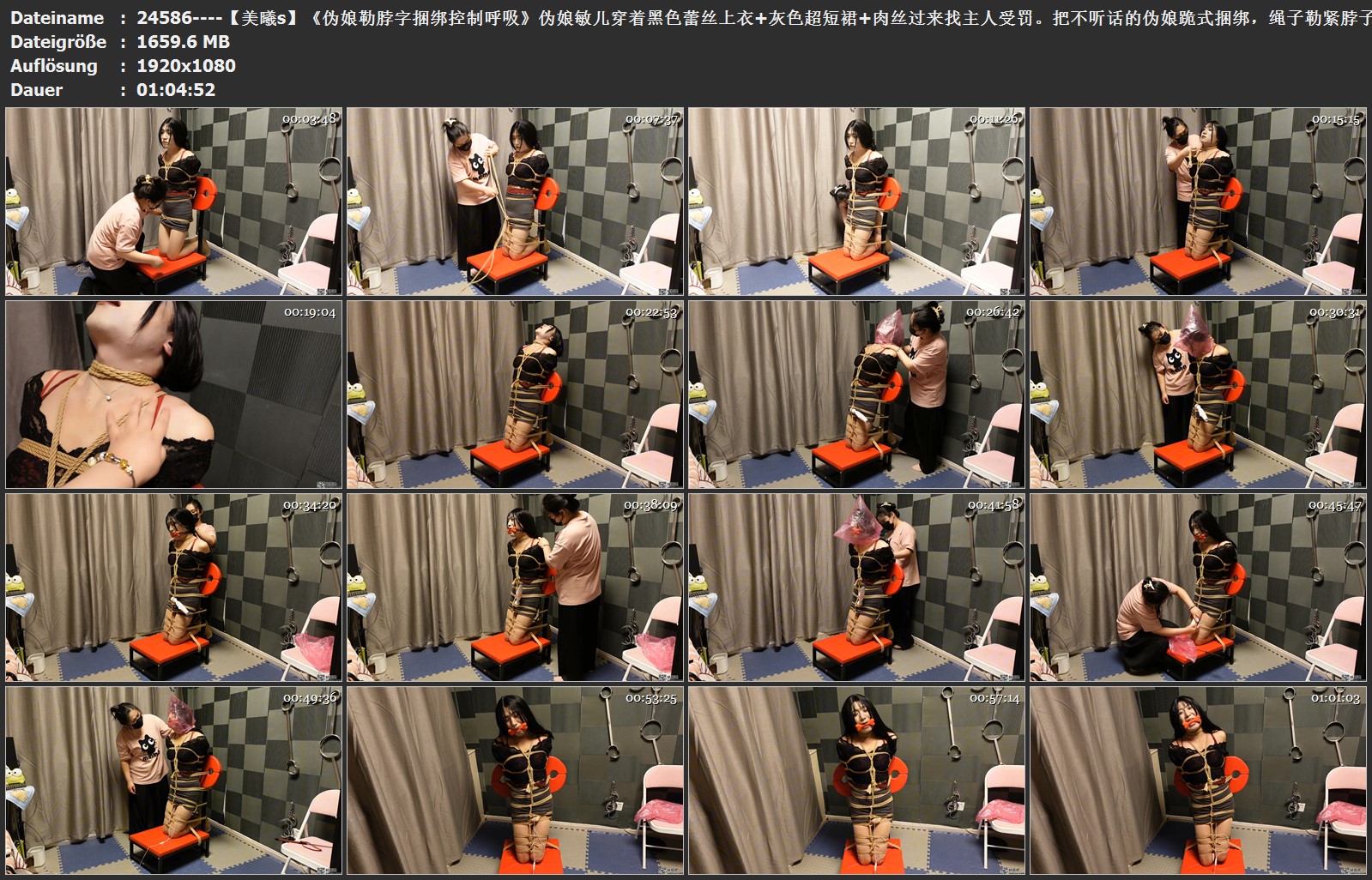 【美曦s】《伪娘勒脖字捆绑控制呼吸》伪娘敏儿穿着黑色蕾丝上衣+灰色超短裙+肉丝过来找主人受罚。把不听话的伪娘跪式捆绑,绳子勒紧脖子,在脑袋上套上袋子控制呼吸,袋子里的空气越...