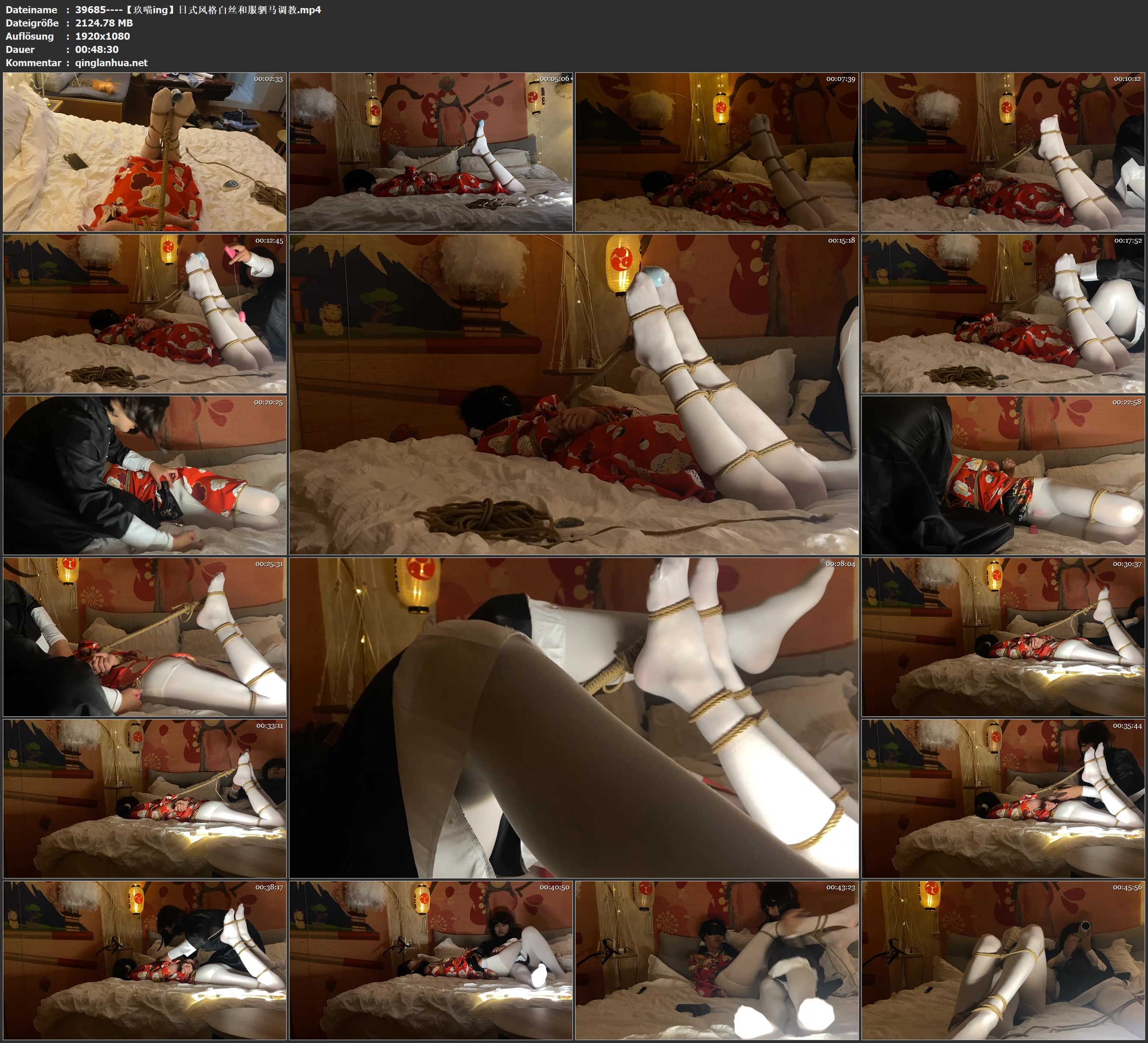 进来发现一个白丝和服女孩被驷马绑在床上,带着眼罩和红色口球,连白丝小脚也被紧紧束缚在一起,把玩一番后,拿杯子让她用白丝双脚夹着杯子,如果没夹到杯子掉了的话就要接受皮棍打屁屁哦~看的出来小脚已经很用力了,可惜还是掉了哦….又把她提起来重重摔在床上,下面塞上玩具,尽情呻吟吧,一边要忍受玩具的折磨又要被无限抚摸,时不时打一下屁屁,最后抱在怀里抚摸,被禁缚的双腿只能挣扎